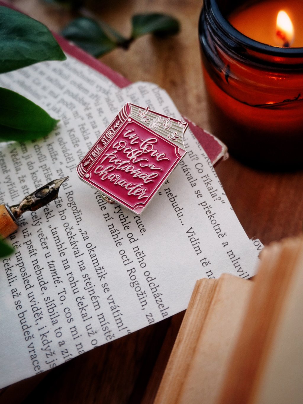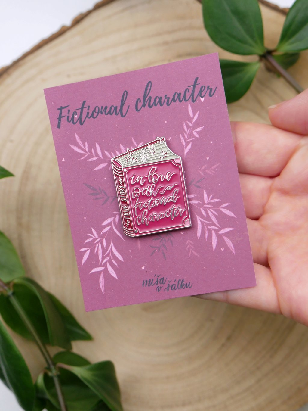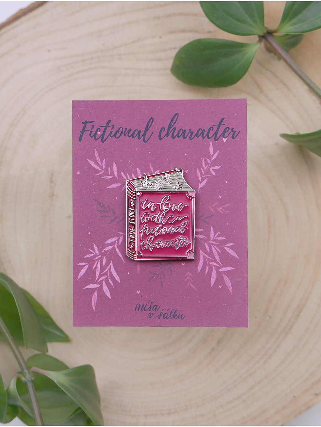 Malý odznáček s velkým významem a nápisem In love with fictional character (Zamilovaná*ý do fiktivní postavy).