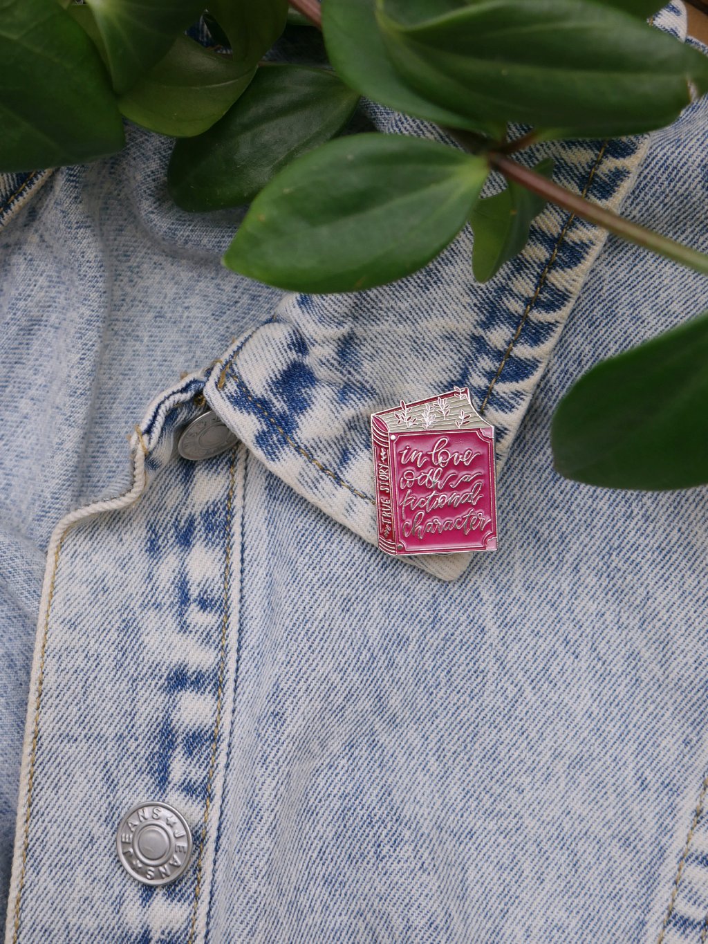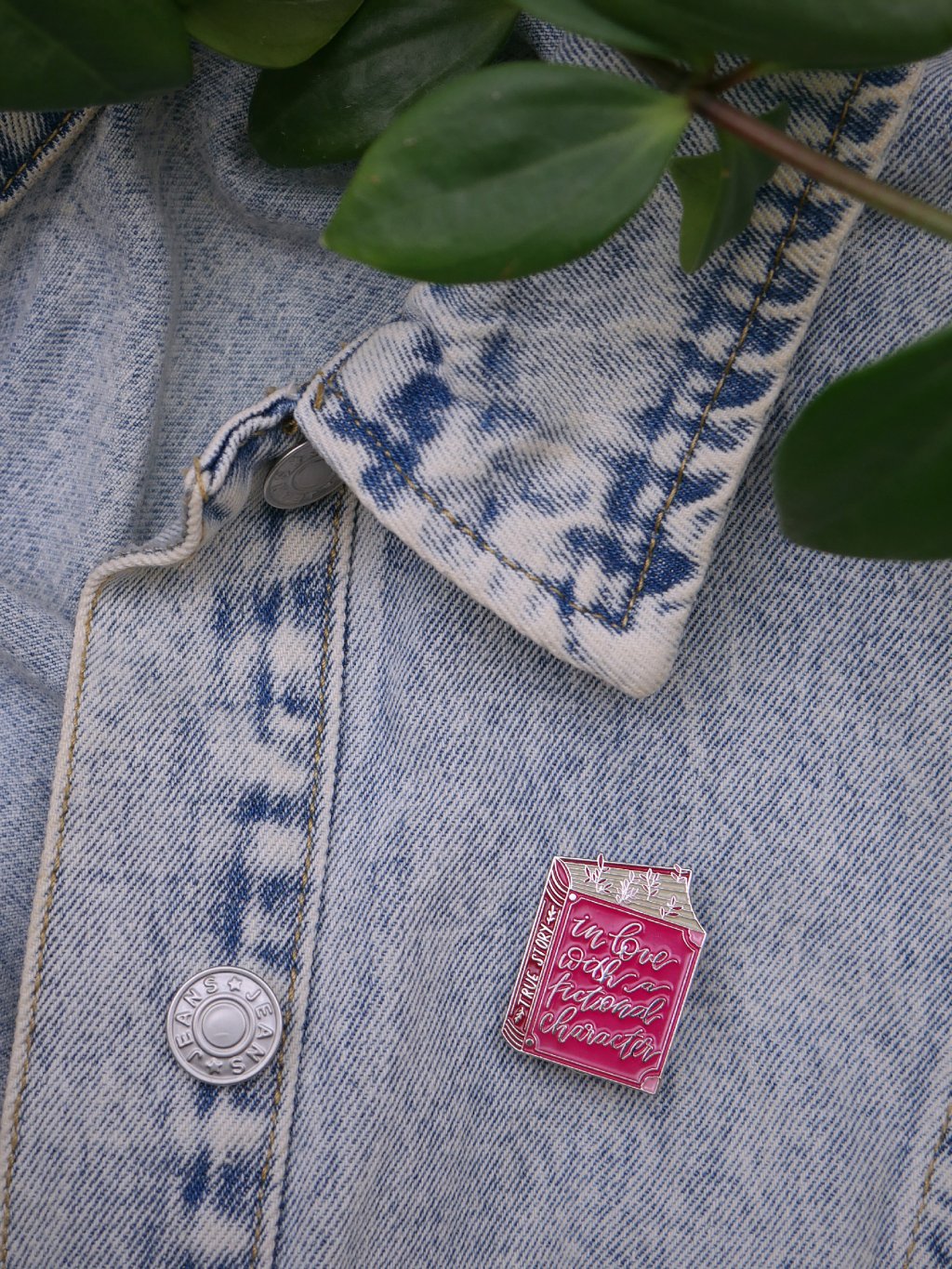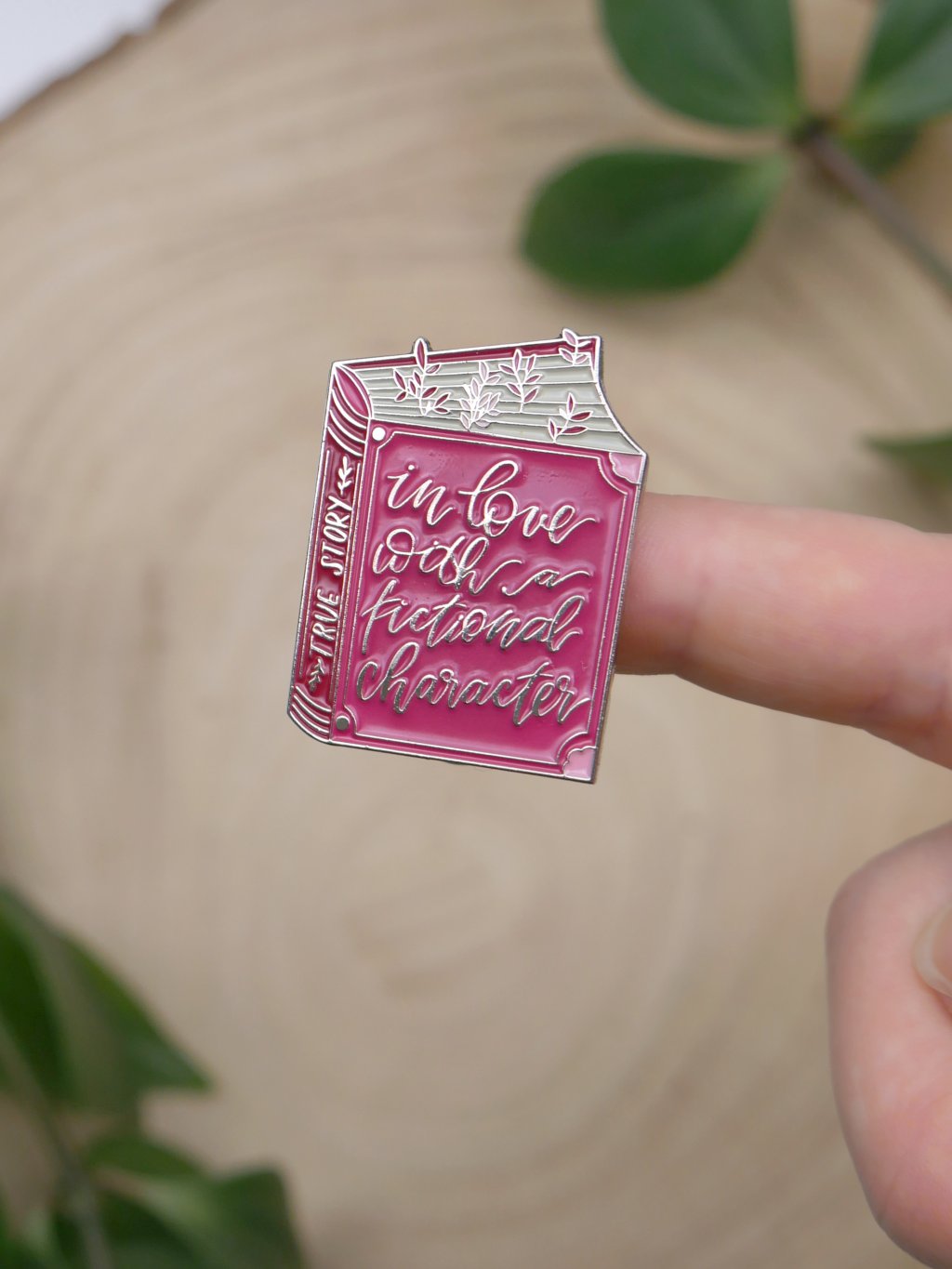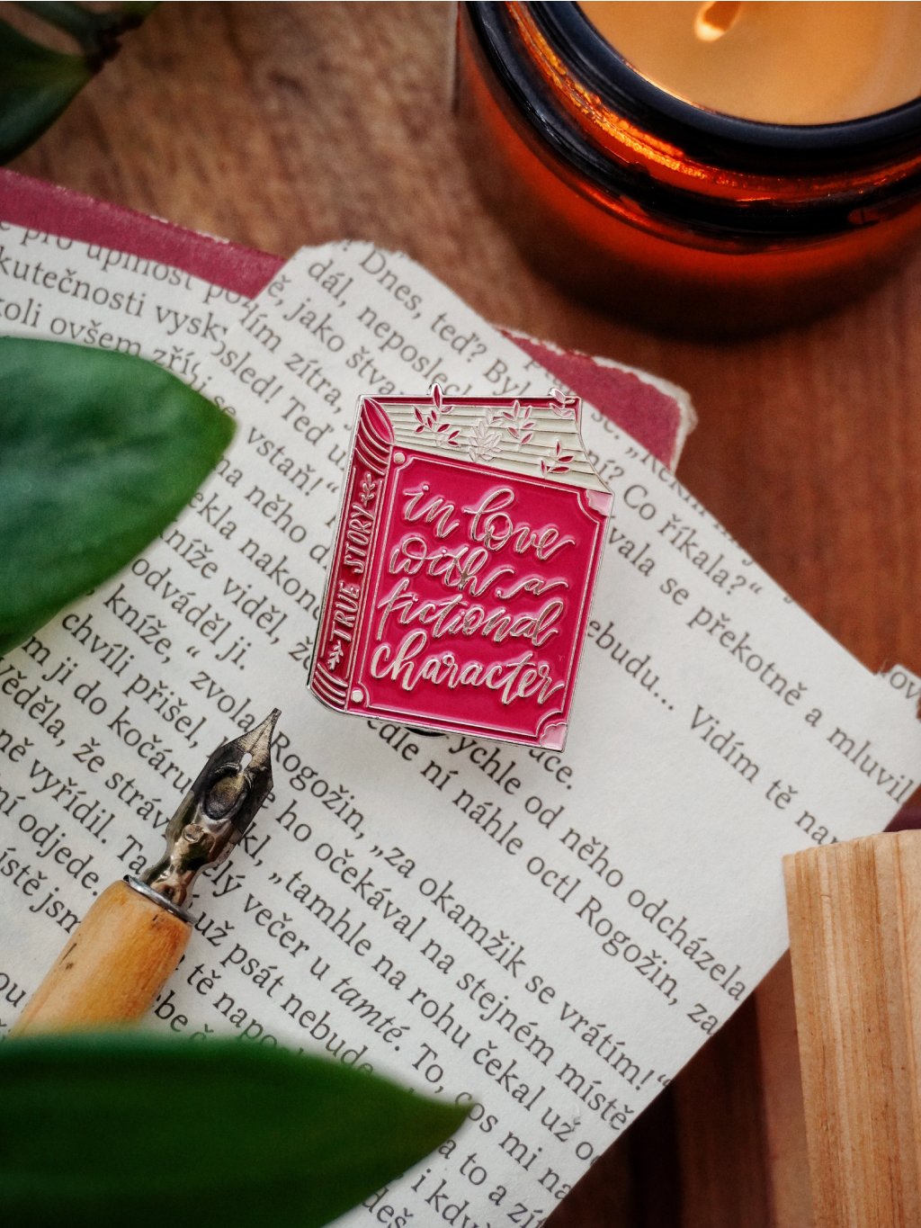 Malý odznáček s velkým významem a nápisem In love with fictional character (Zamilovaná*ý do fiktivní postavy).