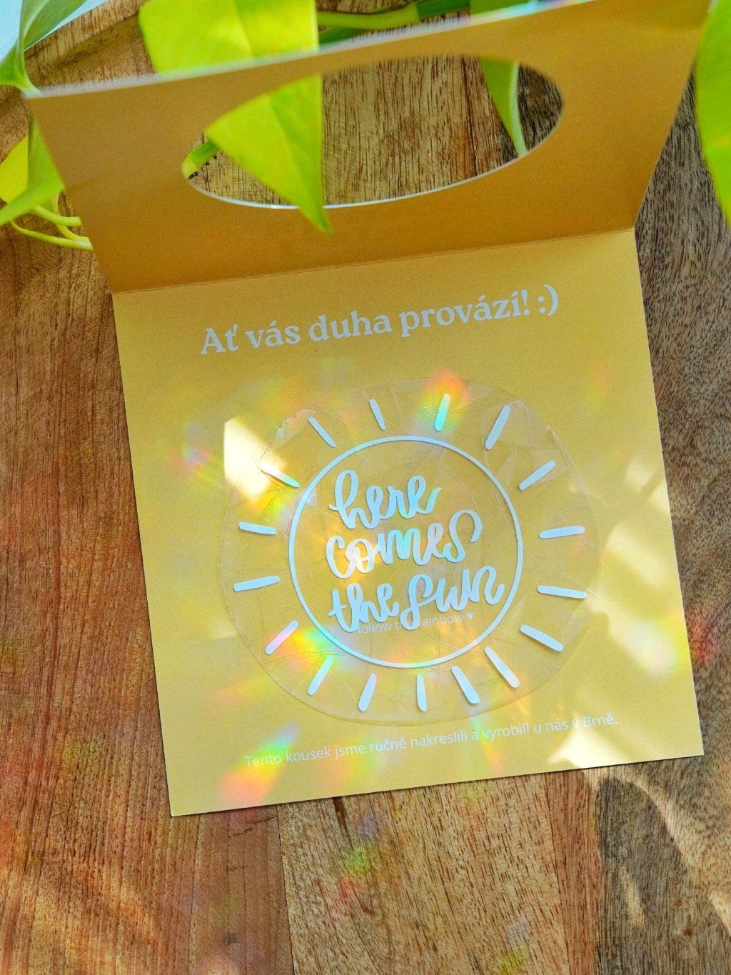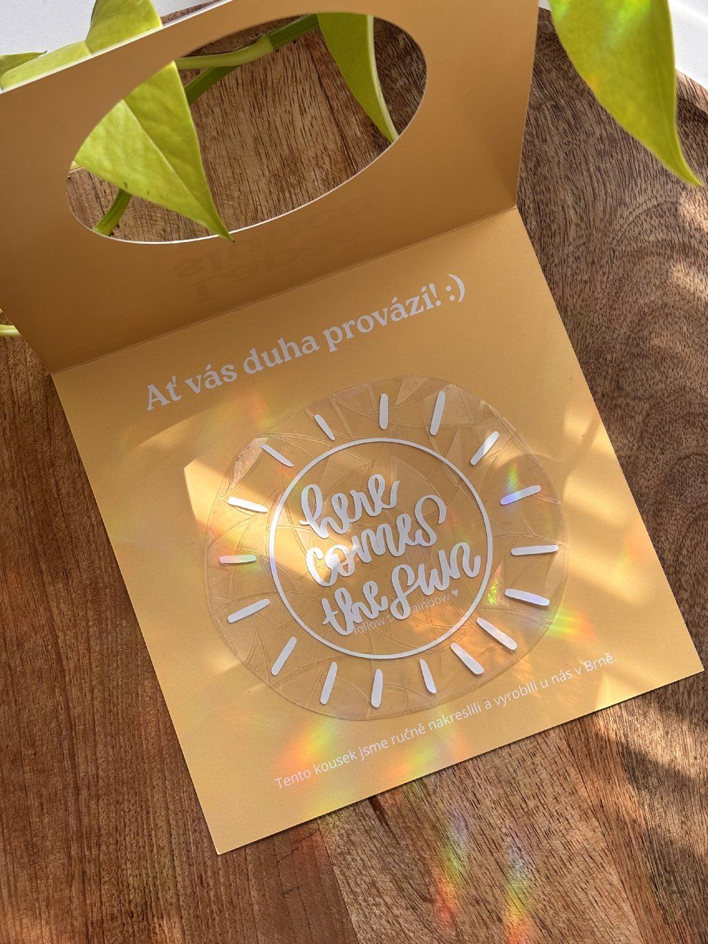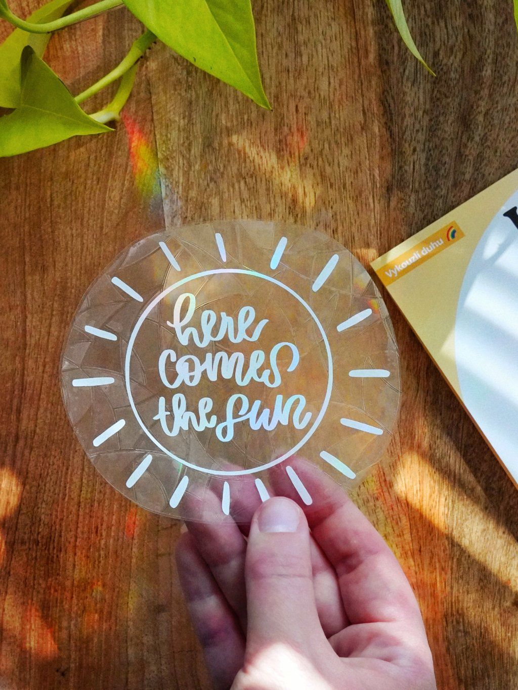 Pozvěte si domů duhu! 🌈 S nalepovacím lapačem slunce přilákáte barvičky přímo k vám do pokoje a rozveselíte si každý den. Tento kousek zdobí ručně psaný nápis Here comes the sun v bílém provedení.