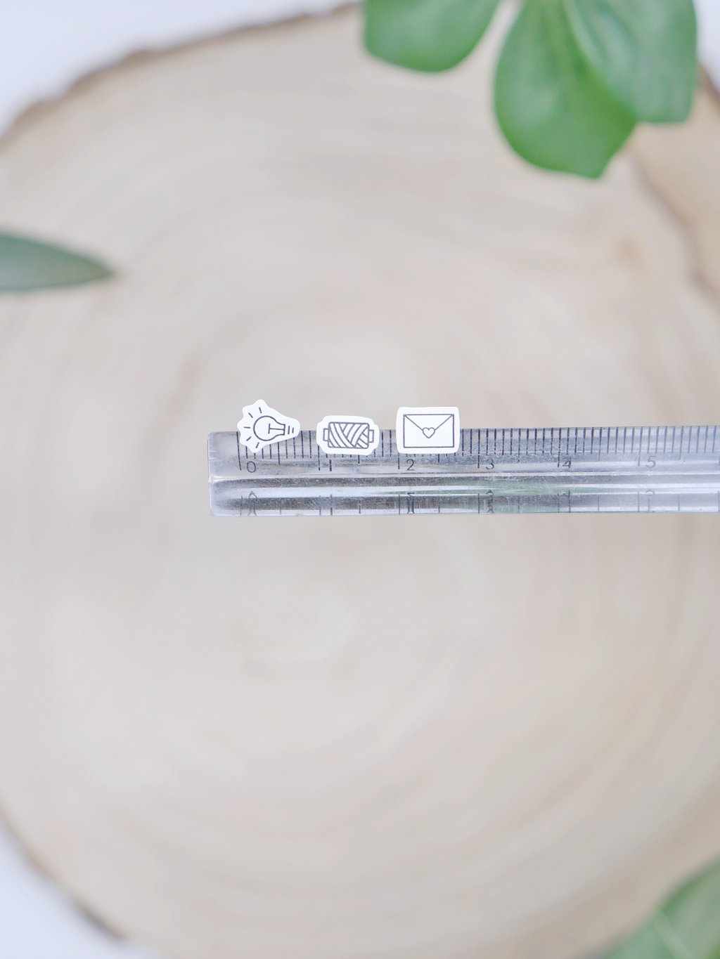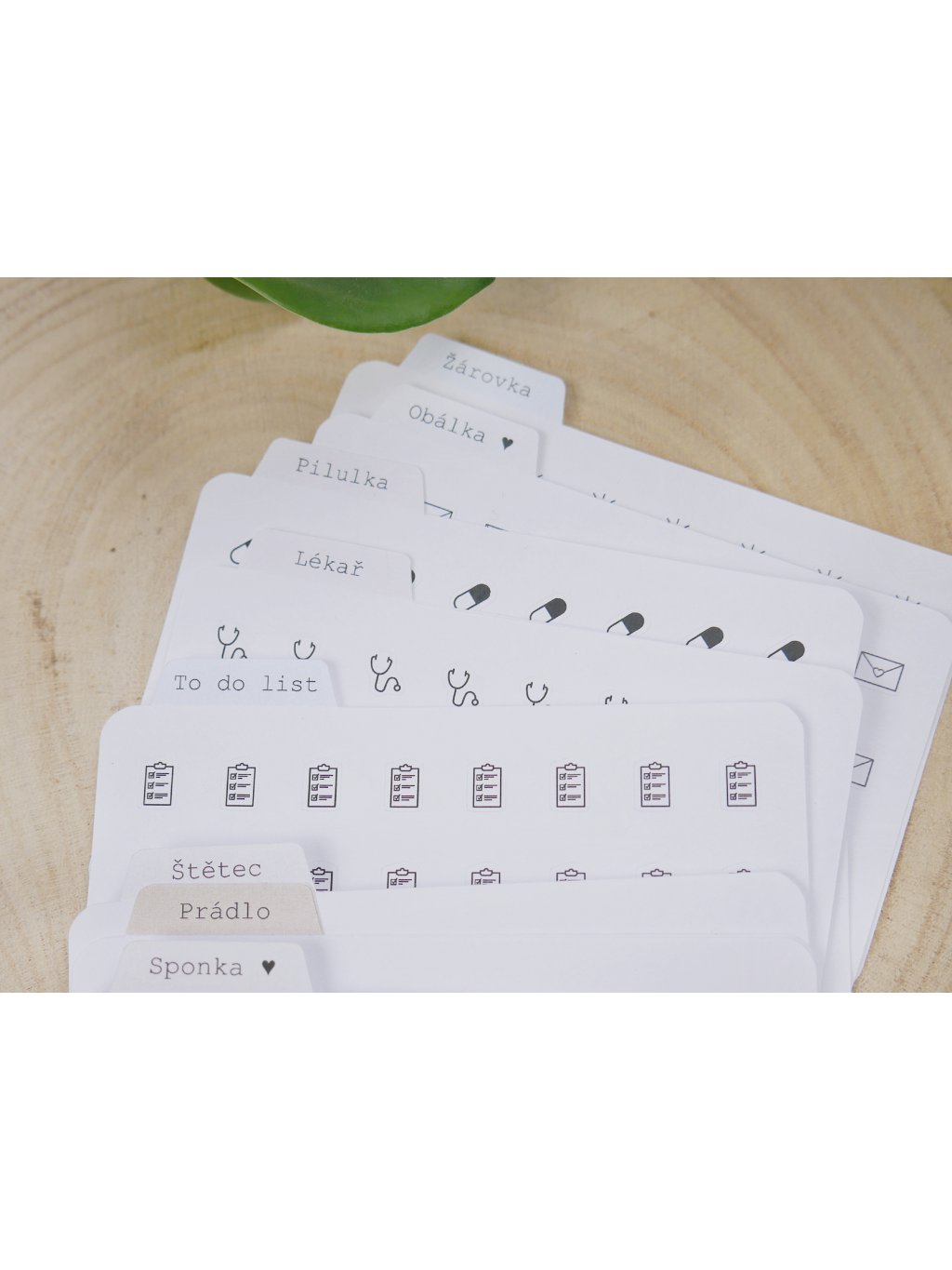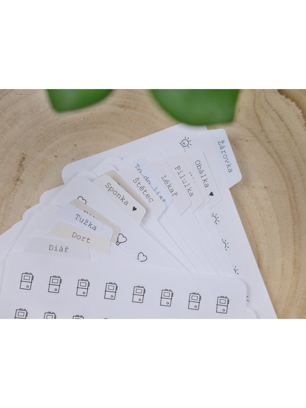 Malý aršík samolepek s mini ikonkami je určený nejen pro majitelky a majitele menších diářů, ale také pro ty, kteří mají rádi minimalistické plánování. Drobné grafické ikonky se však budou hodit i jako doplnění klasických obrázkových samolepek, takže po nich rádi sáhnou i milovníci bullet journalu. :)