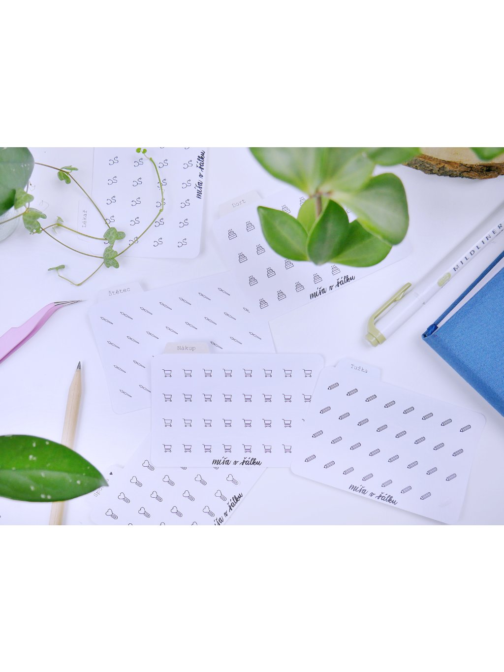 Malý aršík samolepek s mini ikonkami je určený nejen pro majitelky a majitele menších diářů, ale také pro ty, kteří mají rádi minimalistické plánování. Drobné grafické ikonky se však budou hodit i jako doplnění klasických obrázkových samolepek, takže po nich rádi sáhnou i milovníci bullet journalu. :)