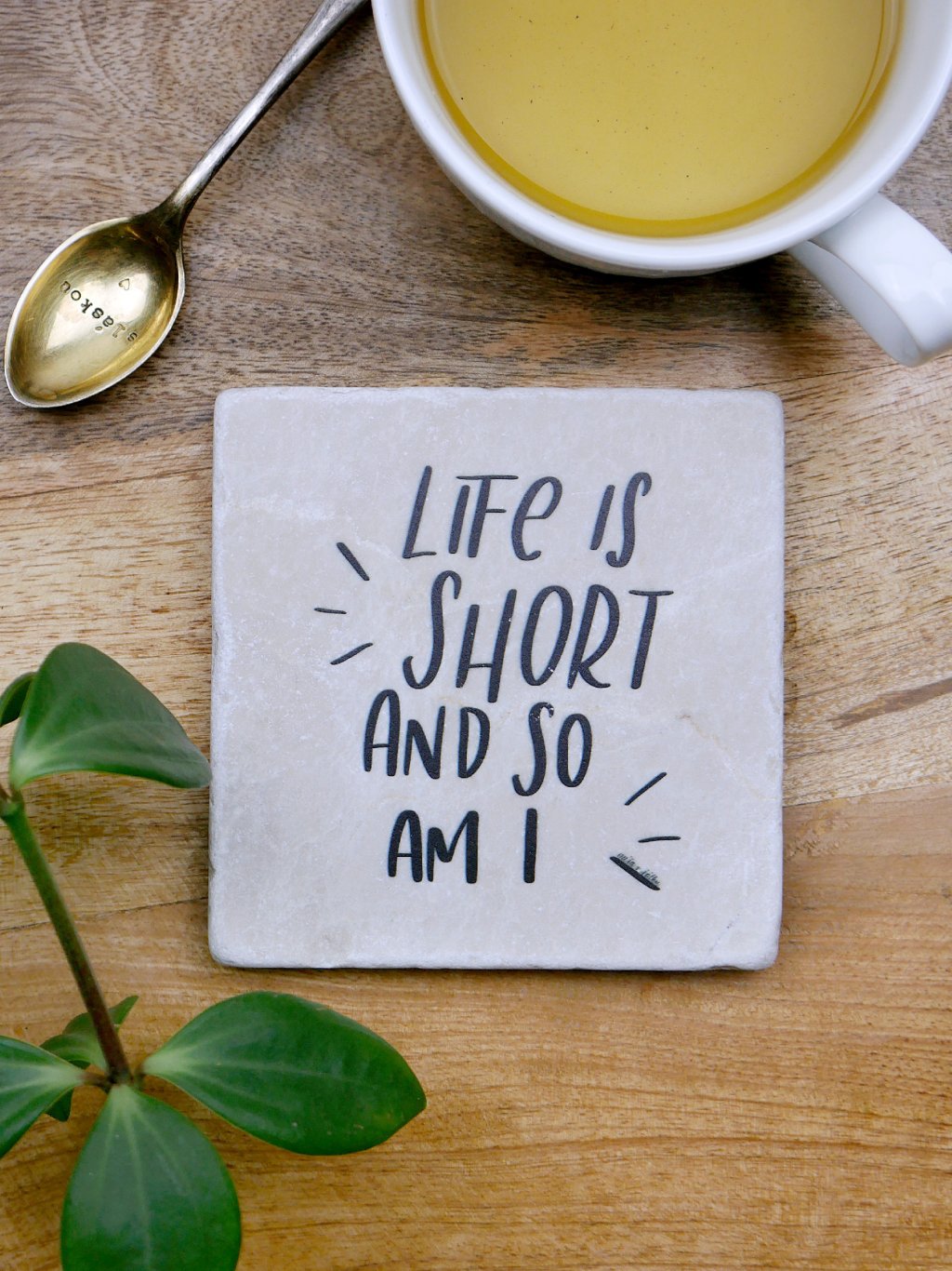 Mramorový tácek pod hrnek s čajem i kávou, ale i pod skleničku s oblíbeným drinkem, bude do-ko-na-lým dárkem pro kamarádku, maminku i kolegyni. Podtácek je vyrobený ve Znojmě a radost vám udělá naší autorskou ilustrací a nápisem Life is short and so am I. :)