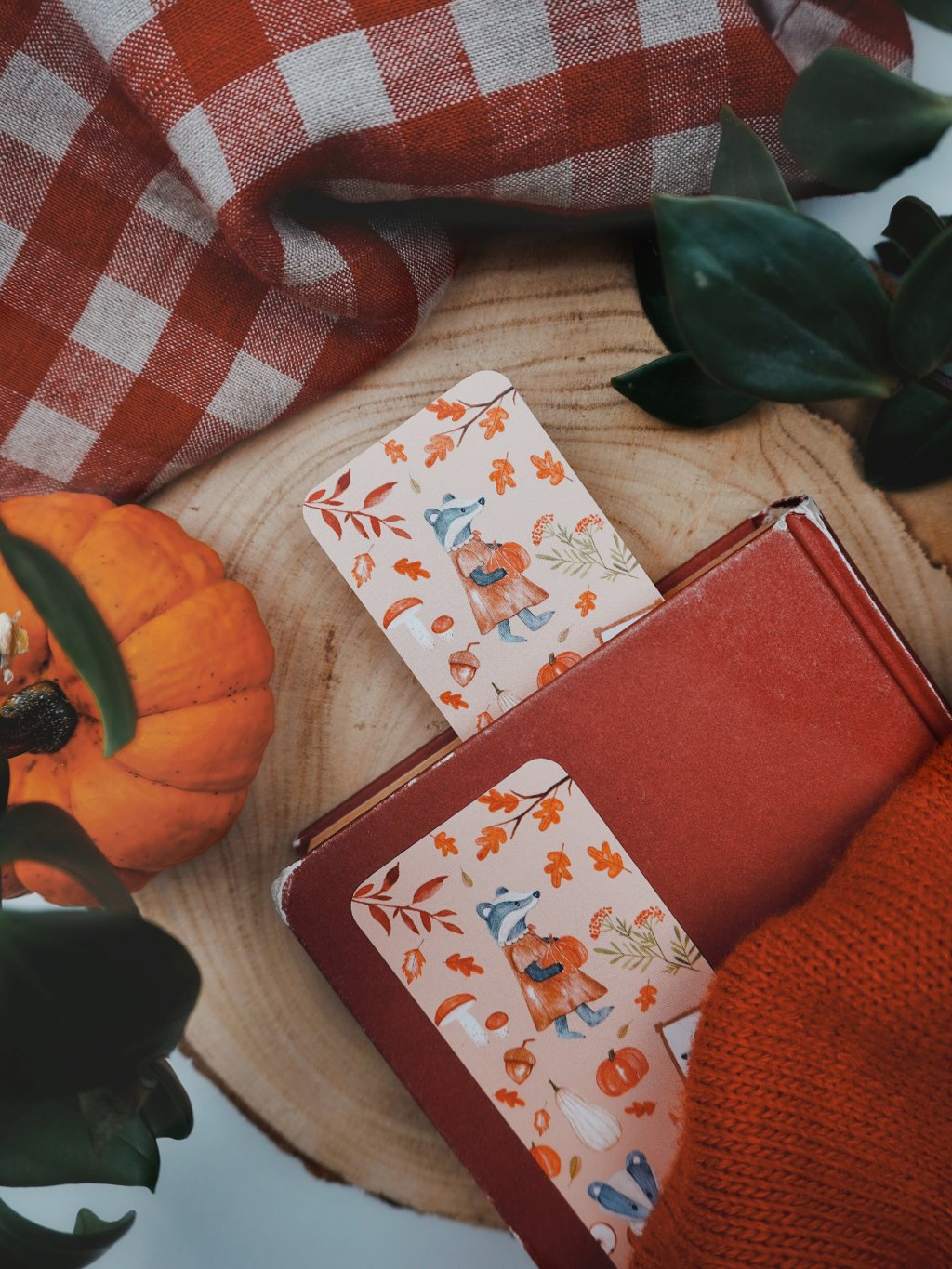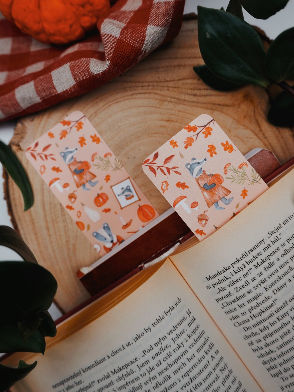 Papírová záložka do knihy zdobená autorskou ilustrací jezevců a dýní potěší jak každého knihomola i knihomolku, tak milovníka roztomilostí. Pokud hledáte drobnost pro radost nebo třeba dekoraci do diáře, tahle záložka čeká přímo na vás.