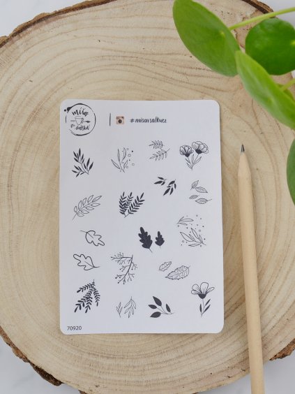 V aršíku najdete samolepky v černé barvě s motivy lístků a květin.