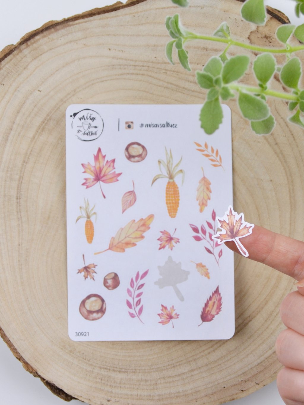 V aršíku najdete samolepky s podzimními listy, kaštany a kukuřicemi.