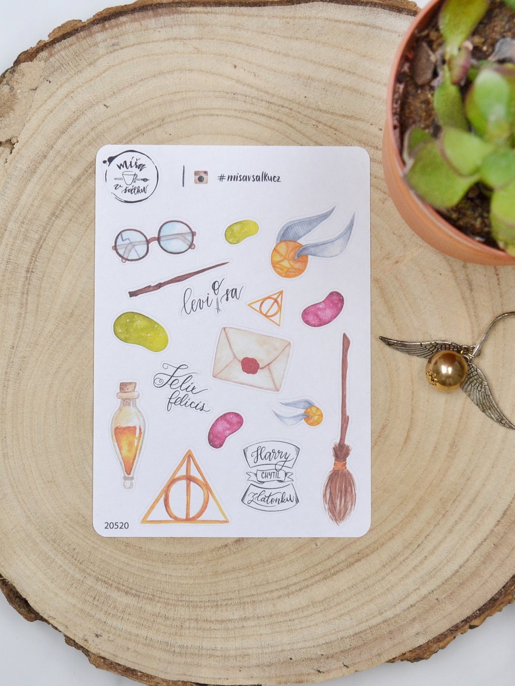 Aršík obsahuje celkem 16 vyřezaných samolepek s motivem Harryho Pottera na matném papíře.