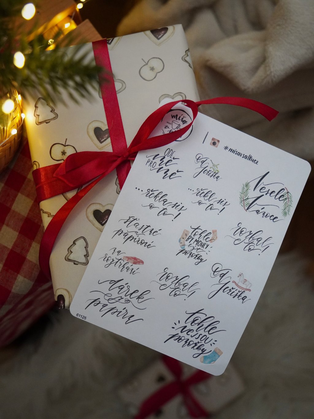 Samolepka jako třešnička na zabalený vánoční dárek? Proč ne! Ty naše udělají z dárků roztomile veselé kousky, které vykouzlí úsměv na tváři ještě dřív, než je stihnete rozbalit. Aršík samolepek je plný vánočních, ručně psaných textů, kterými můžete ozdobit balicí papír, jmenovky na dárky nebo dárkové taštičky. Stačí jen vybrat ten správný! :)