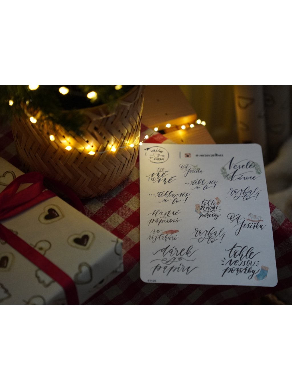- V aršíku najdete samolepky s kaligrafickými nápisy a vánočními obrázky.