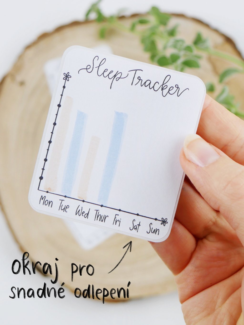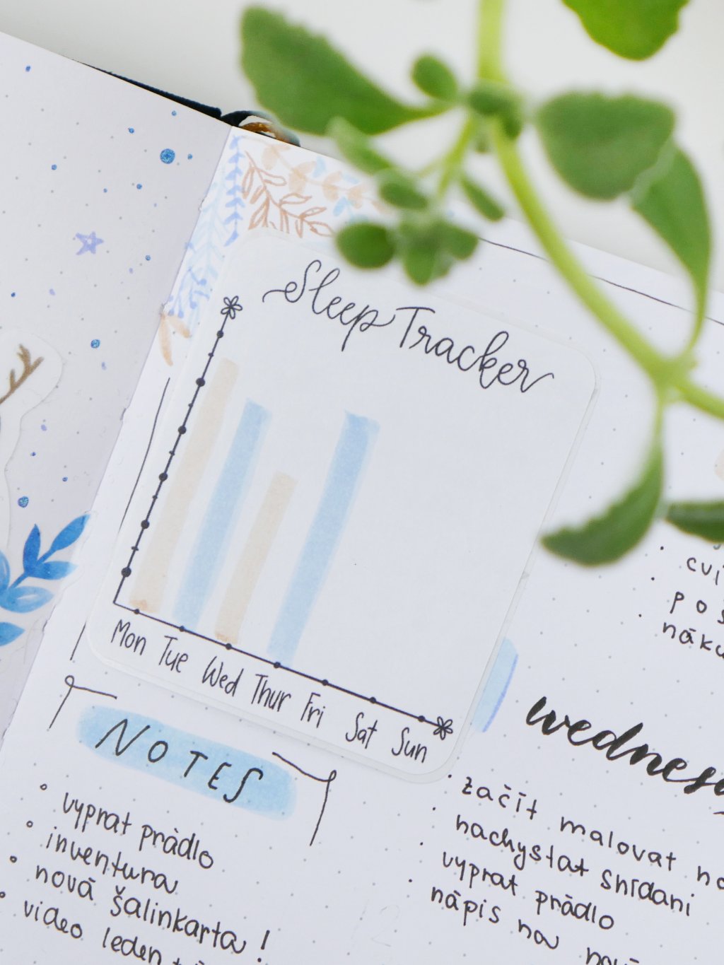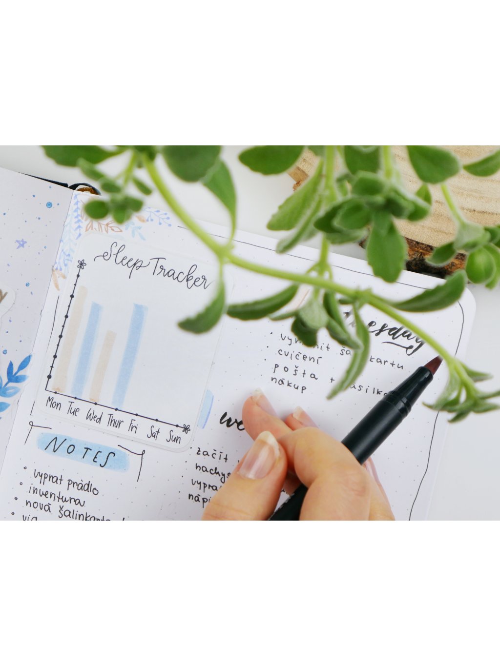 Jednou ze skvělých bullet journal tracker tabulek je takzvaný sleep tracker, který pomáhá sledovat dobu spánku. Užitečný je, pokud chcete mít přehled o pravidelnosti a délce spánku, případně pokud je vaším cílem dopřát si odpočinku více. V bullet journalu jde o velmi oblíbený prvek, který díky naší samolepce vytvoříte během několika vteřin. A tak vám zbyde třeba víc času na sladké snění! :)