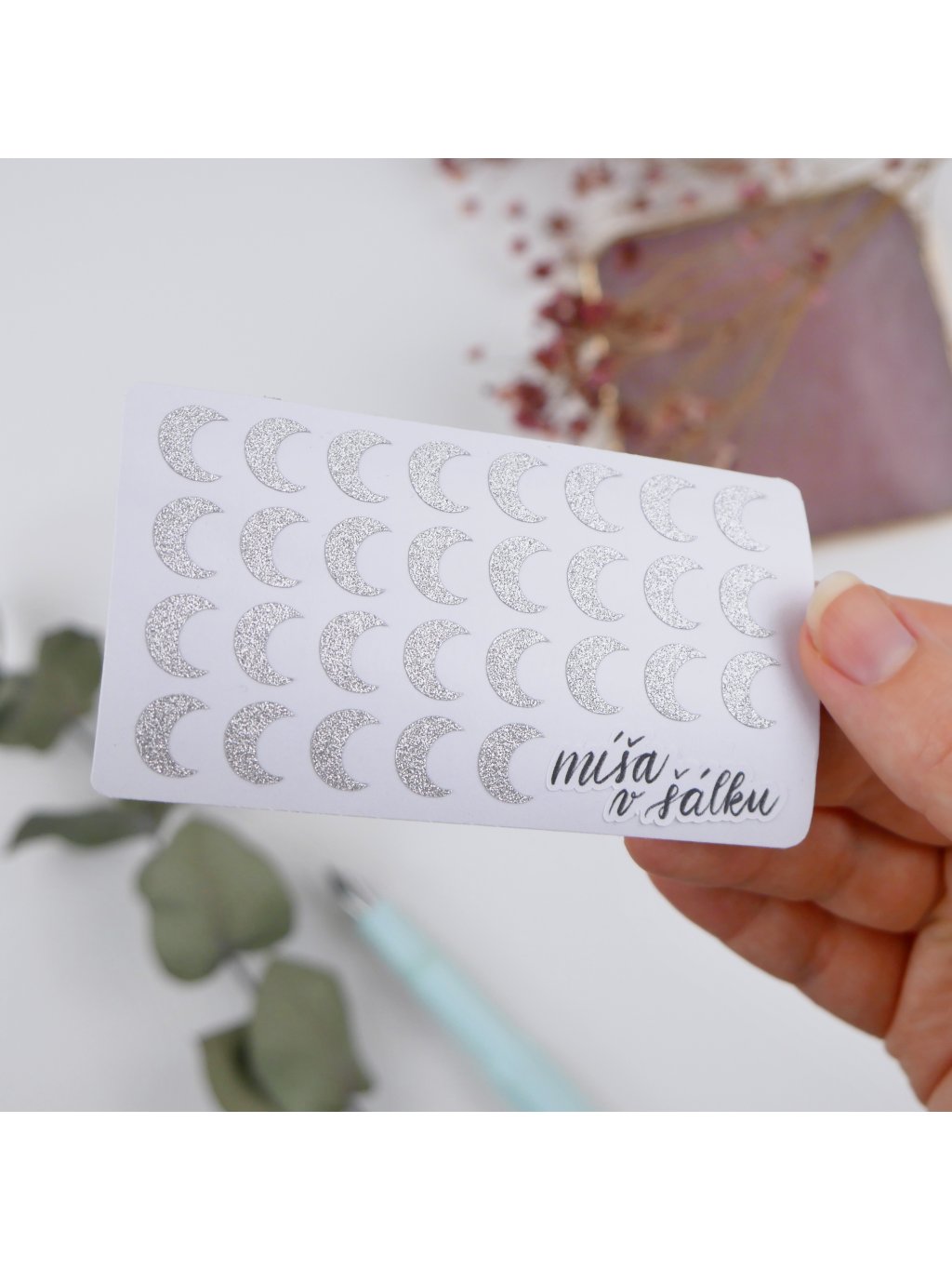 Elegantně třpytivé vinylové samolepky dodají pozlátko nejen stránkám vašeho diáře, ale také jeho deskám! Vinyl skvěle drží na různých hladkých materiálech, proto si se samolepkami třpytivých stříbrných měsíců ozdobíte například hrníčky, potravinové dózy nebo třeba šuplíky plné papírenských radostí. :)