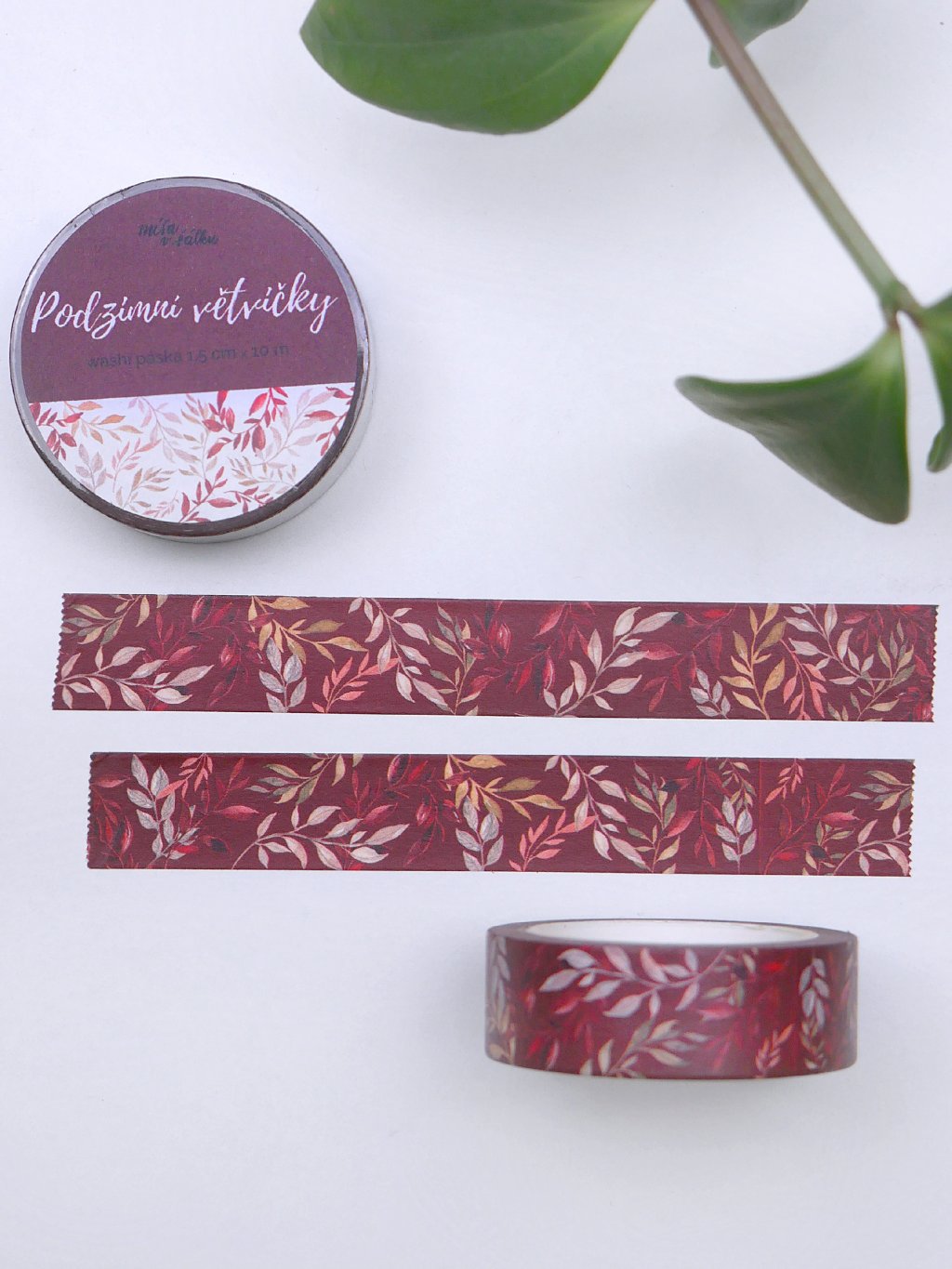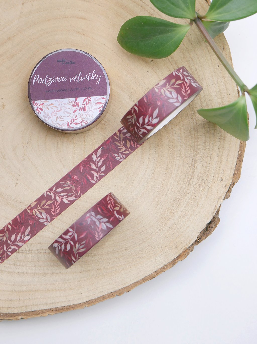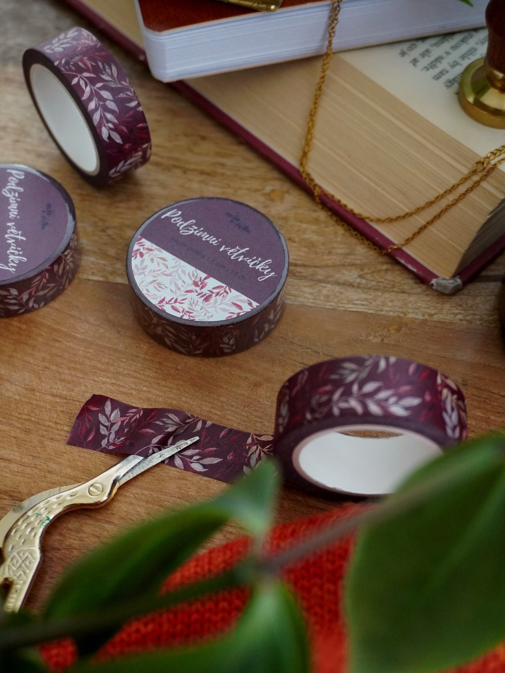 Washi páska je ozdobená autorskou ilustrací podzimních lístků a větviček na dokonalém, tmavě vínovém pozadí. Využijete ji na zdobení diáře, k ozdobení fotoalba nebo třeba na přichycení fotek na stěnu.