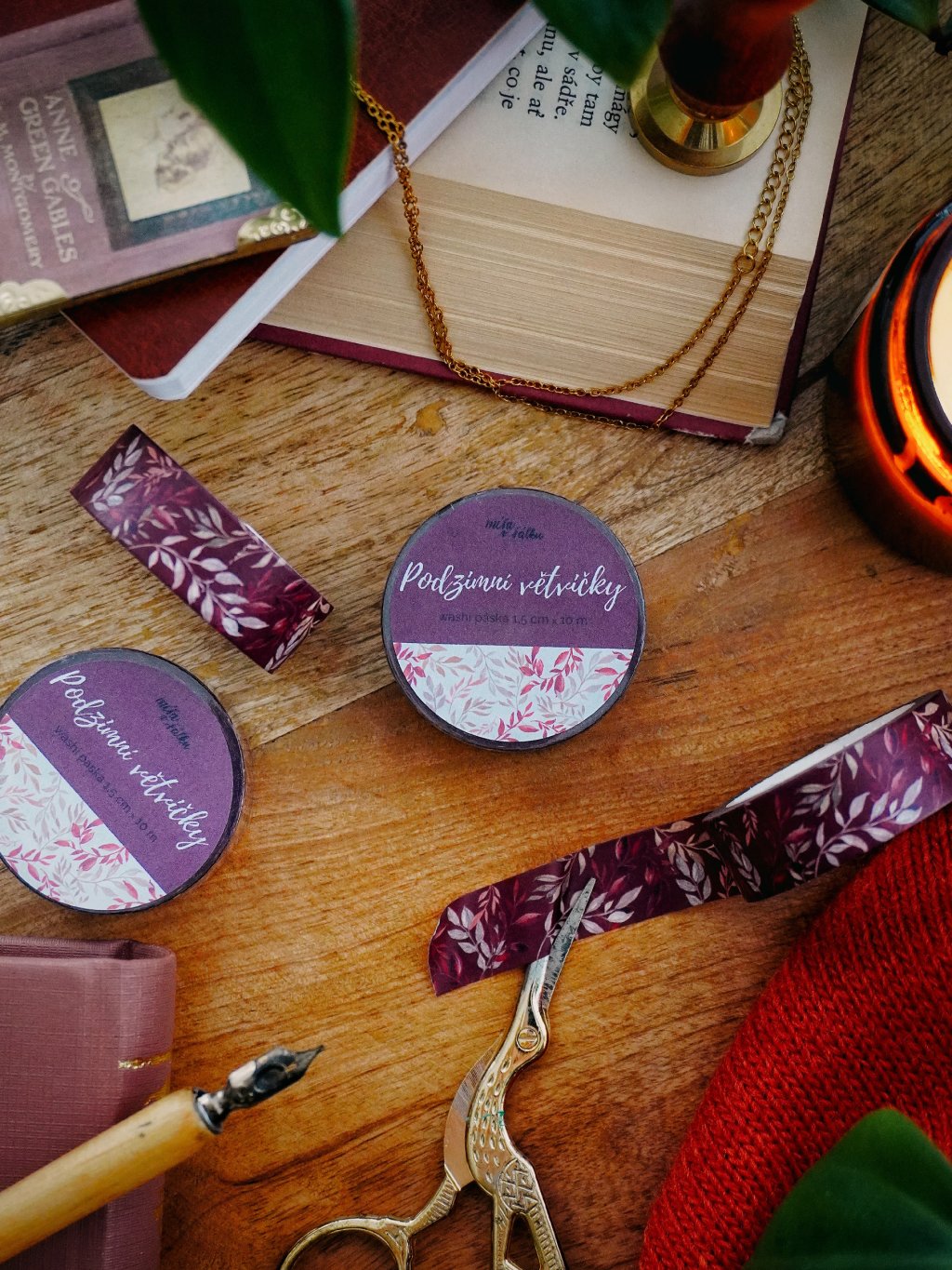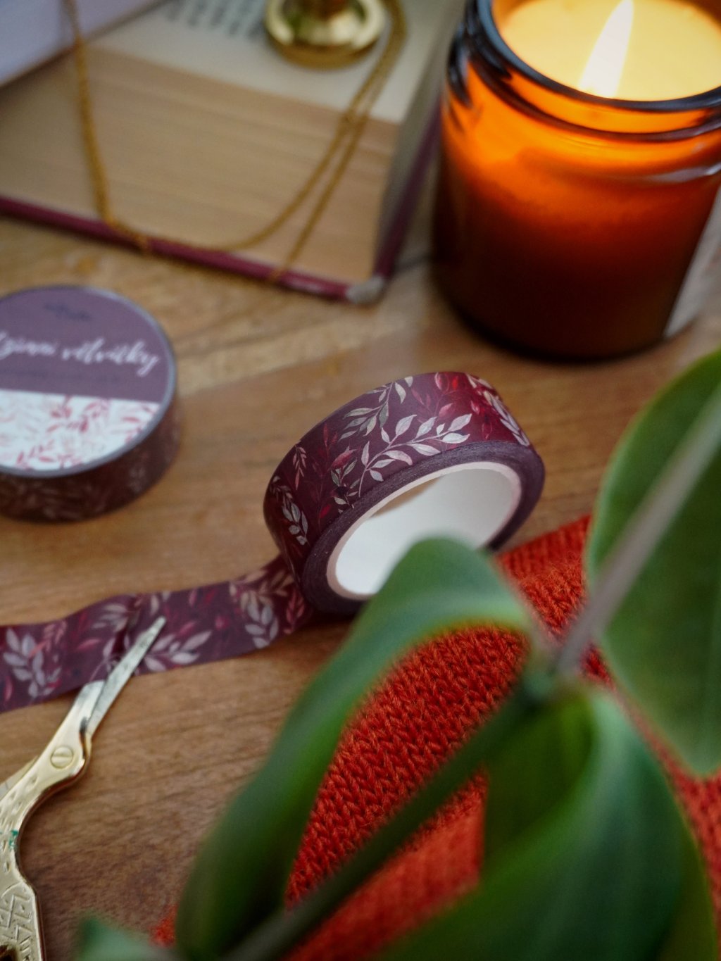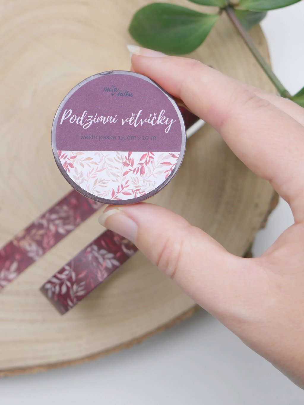 Washi páska je ozdobená autorskou ilustrací podzimních lístků a větviček na dokonalém, tmavě vínovém pozadí. Využijete ji na zdobení diáře, k ozdobení fotoalba nebo třeba na přichycení fotek na stěnu.